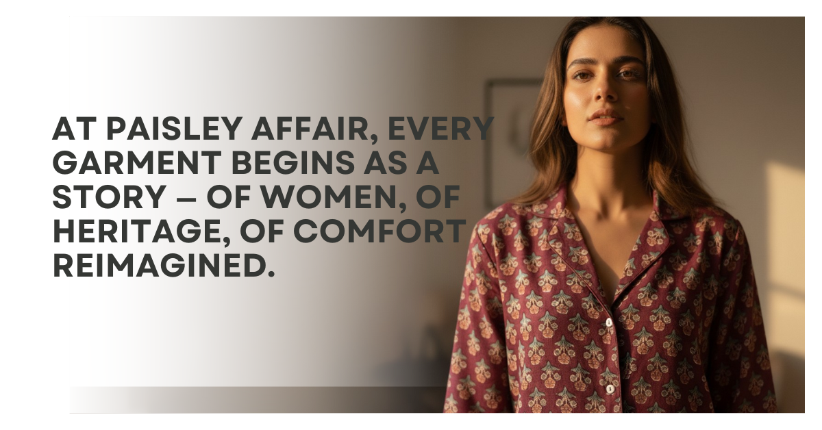 Paisley Affair was born from both memory and longing — the memory of watching artisans carve paisleys into wood with patient hands, and the longing to see that artistry cherished in the modern world. As a woman, I wanted loungewear that honored comfort, but also honored us — our journeys, our heritage, our voices.