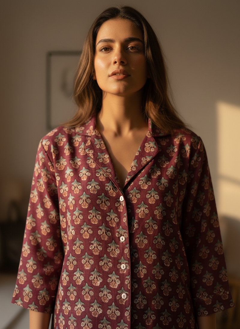 Our new fall print, Sita, is an ode to that timeless light — hand-blocked in deep maroon and burnished gold on soft, breathable cotton. Crafted to honor the woman who shines even in stillness.